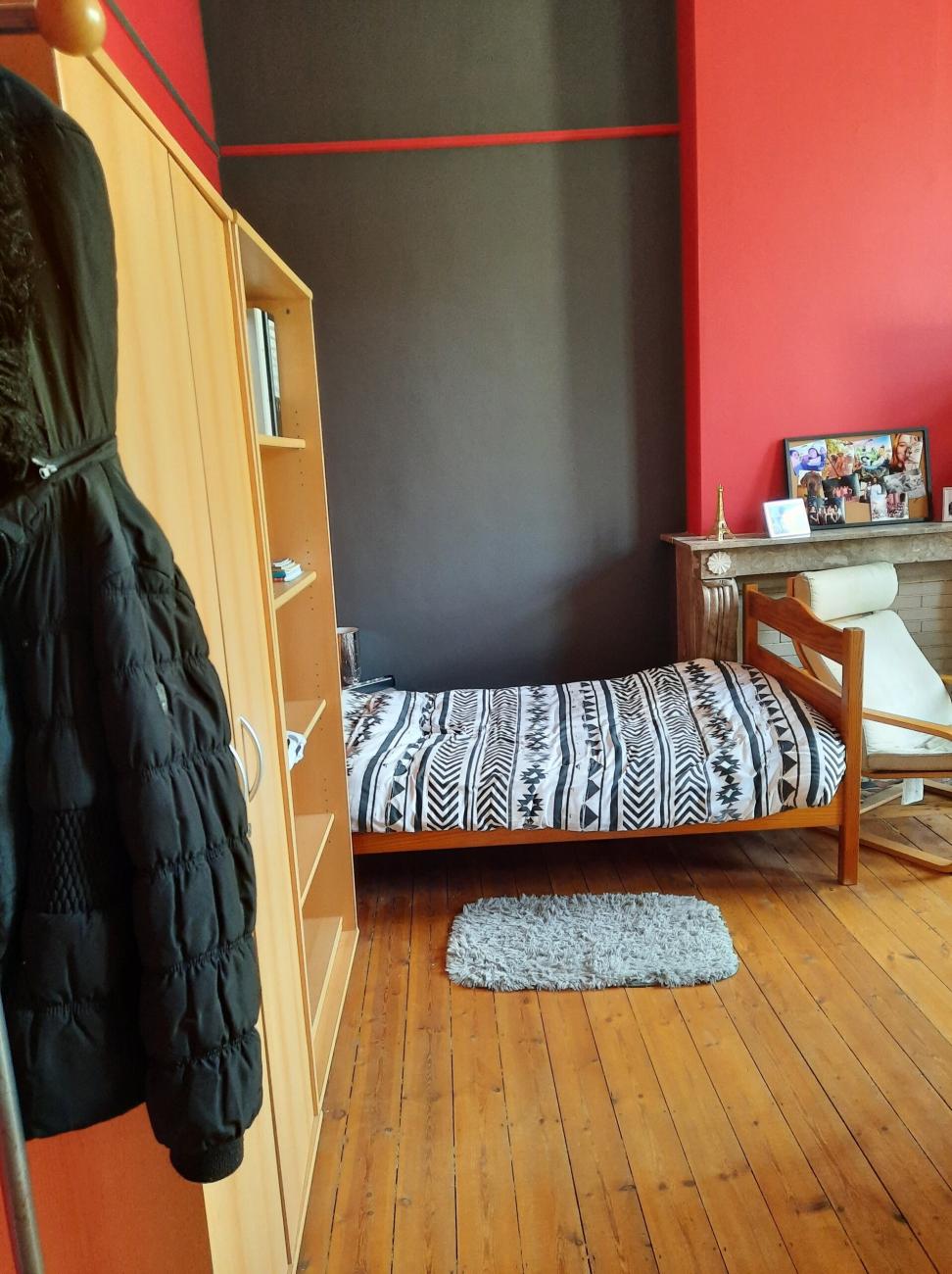 Chambre de 25m2 dans maison unifamiliale, avec coin cuisine dans la chambre. Meublée : lit, armoires, étagères, table, micro-onde, frigo, 2 taques.