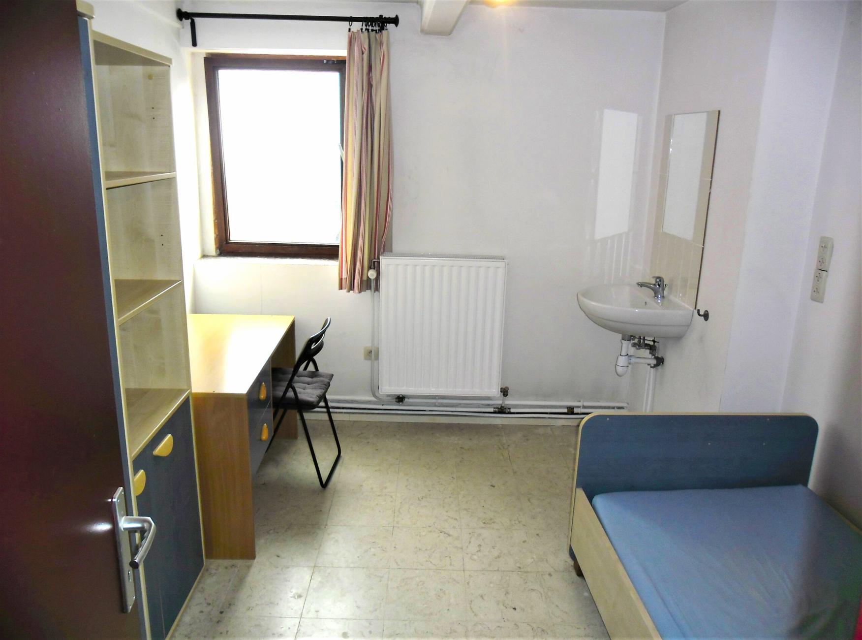 Chambre N° 3 : 10-11 M² située au rez-de-chaussée. 1 fenêtre, carrelage au sol, lit 200 x 90 cm, table de nuit, bureau, garde-robe, meuble de rangement, lavabo privé : Occupée actuellement.