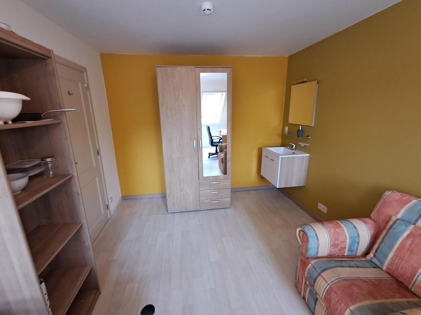 Dans maison familiale récente, chambre meublée (lit 90cm, bureau, chaise,... ) avec lavabo et 2 vélux (mensarde). Douche et cuisine séparées (taques, four, micro onde, frigo, congélateur).