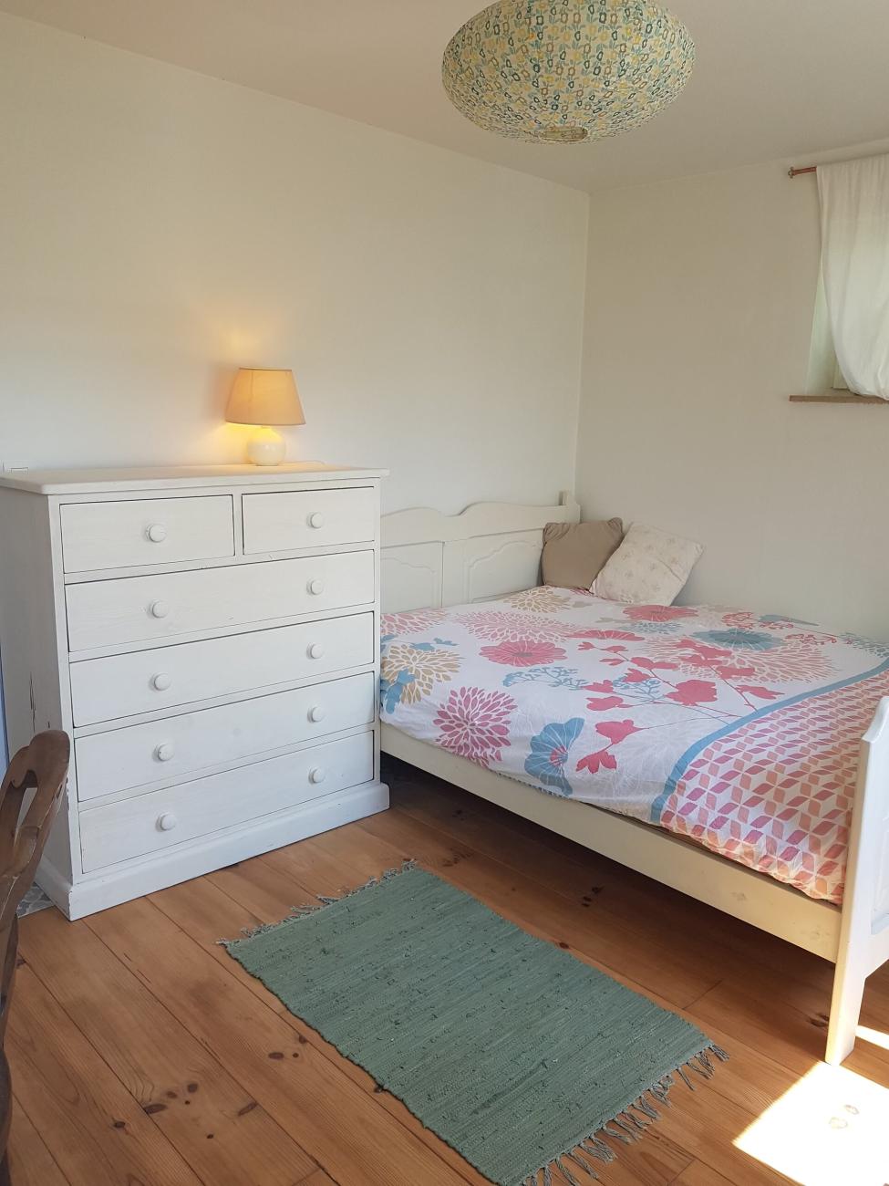 - Room 1: with separate entrance, bed, desk, wardrobes, shelves, and armchair.