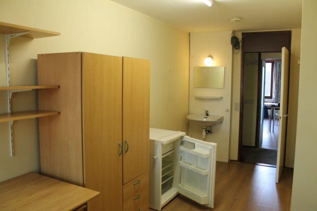 Il y a un lit, une garde-robe, un grand bureau, siège de bureau, des étagères, un réfrigérateur individuel, un lavabo dans la chambre .